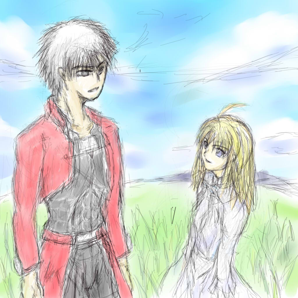 アーチャーとセイバーの再会の瞬間。セイバーは王の縛りから解放され、アーチャーはかつての自分を取り戻していく。仮面はアーチャーになって身に着けた皮肉屋なあり方で、ありのままの自分とはアーチャーのかつて士郎だった時の心という例えに一応してあります。